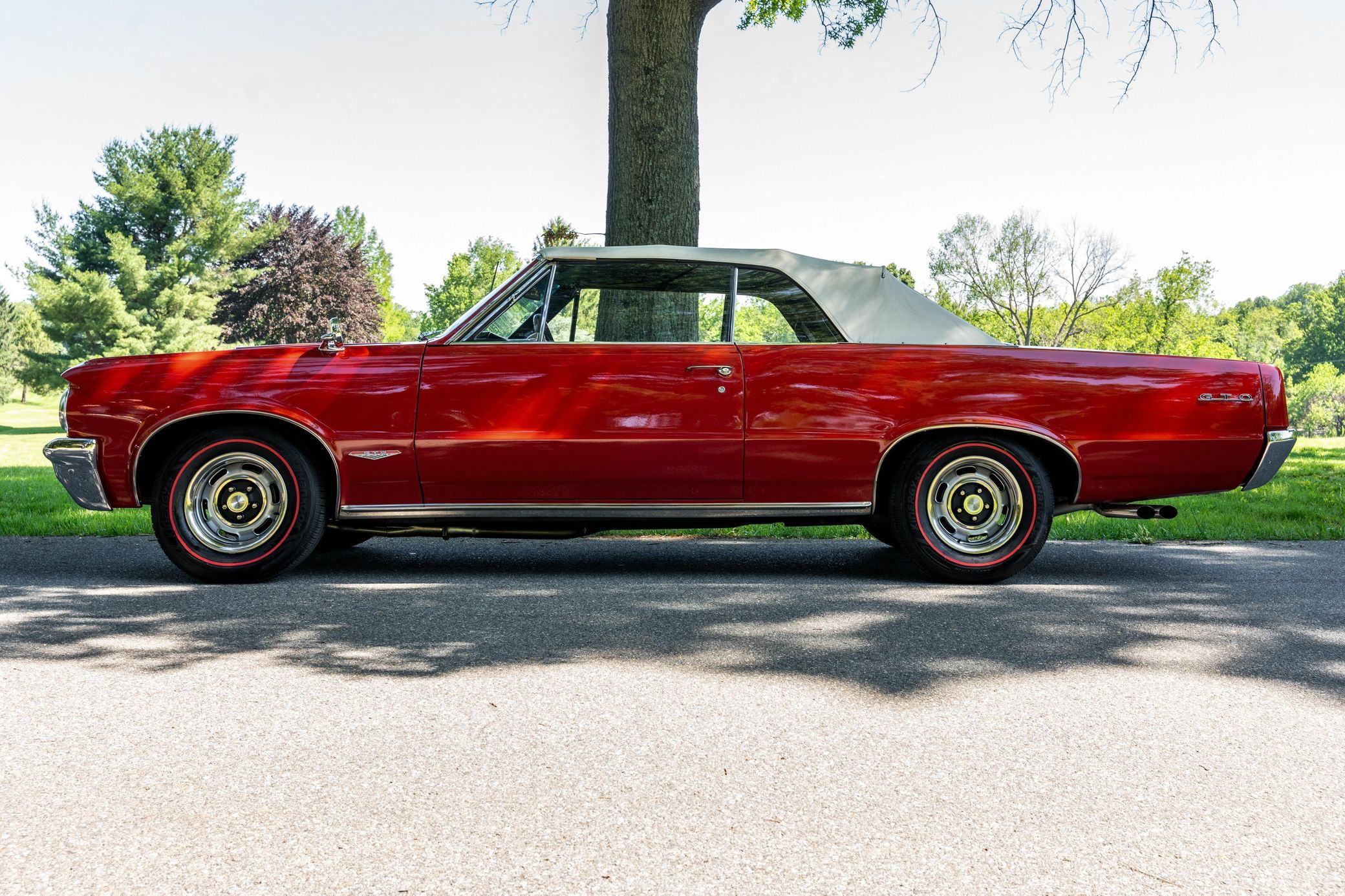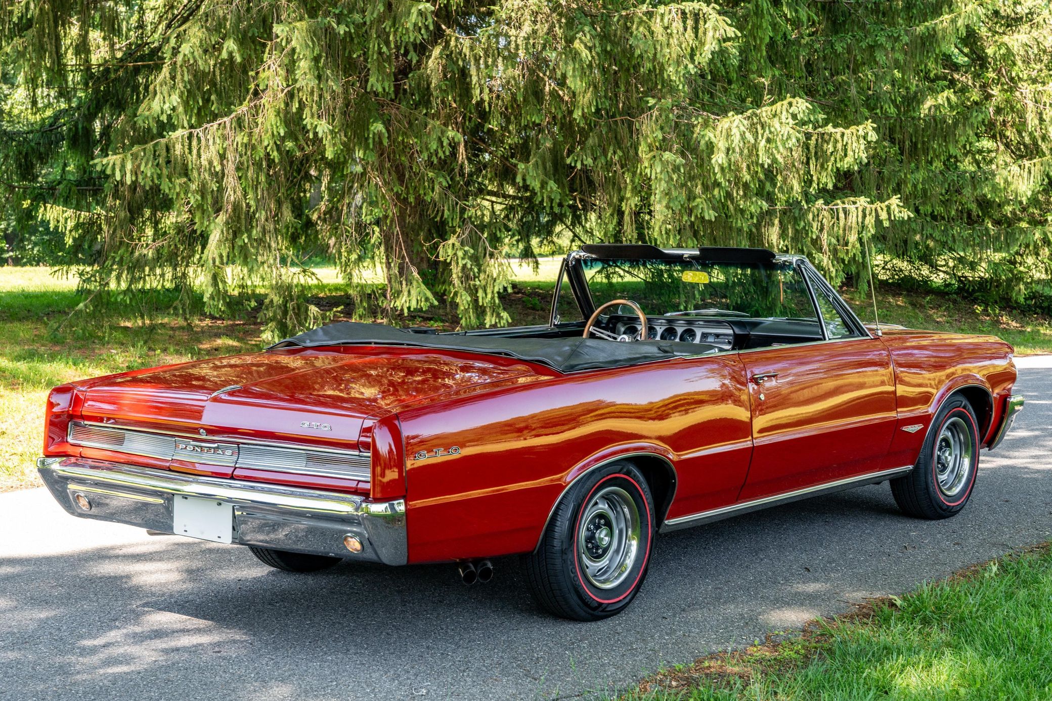 THIS… is a 1964 Pontiac GTO Convertible, finished in Grenadier Red with an Ivory soft top and a black interior. This GTO’s factory-fitted 3-speed manual transmission has been replaced by a TREMEC 5-speed manual. Serial numbers pictured in the gallery indicate that the Tri-Power V8 is original to this GTO. A partial list of notable currently installed equipment reported by the seller includes power steering, 14-inch wheels, front bucket seats, and a wood-rimmed steering wheel. The original GTO is arguably the first true American muscle car. Pontiac wanted to release a more powerful version of the Tempest, but parent company General Motors had a 330-cubic-inch limit on engine displacement in this segment. The rule didn’t apply to option packages, so Pontiac dropped a 389-cubic-inch V8 into the Tempest and offered it at an extra cost. Sales started in 1964, and the GTO was made a standalone model in 1966. The nameplate finally retired in 2006. Power comes from a 389-cubic-inch Tri-Power V8, rated at about 330 horsepower and 430 lb-ft of torque. Output is sent to the rear wheels via a 5-speed manual transmission.