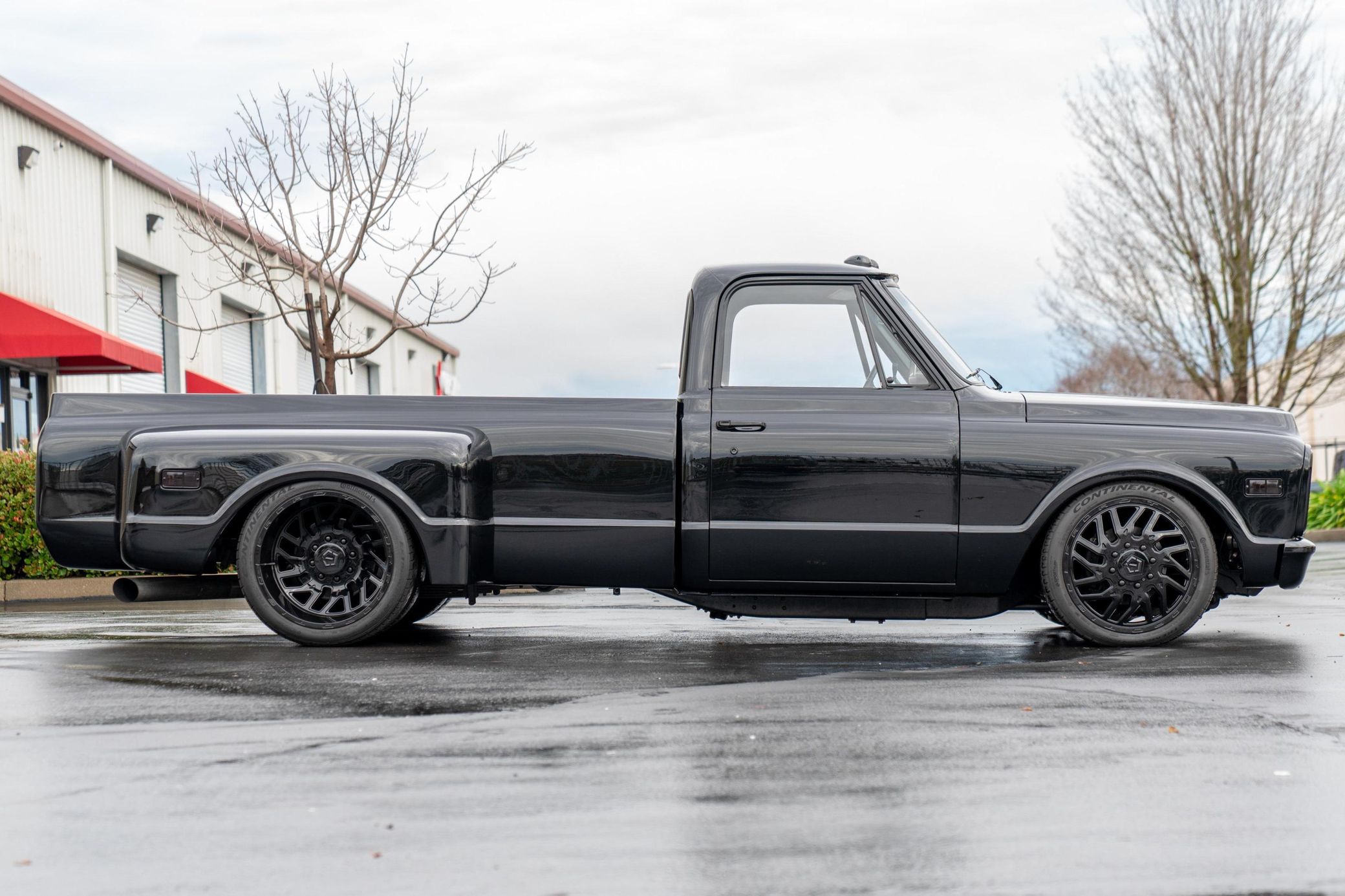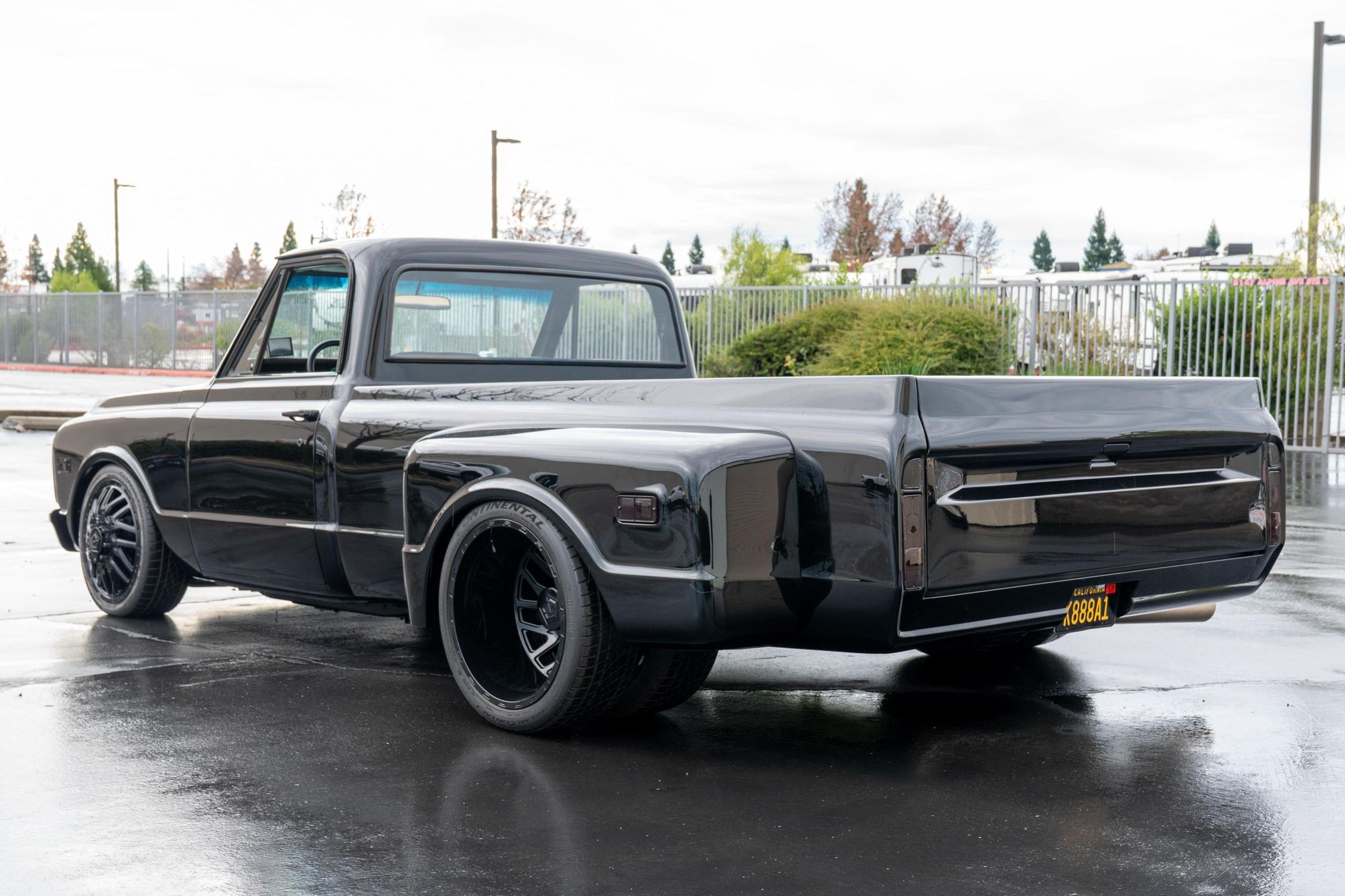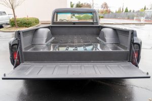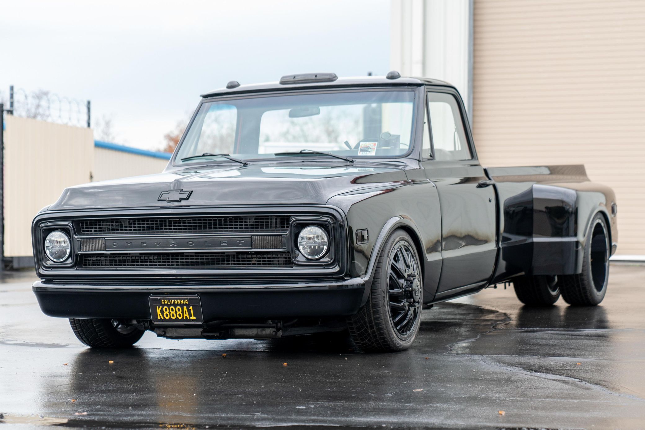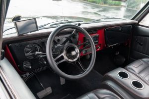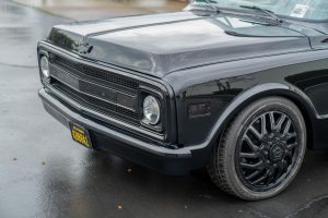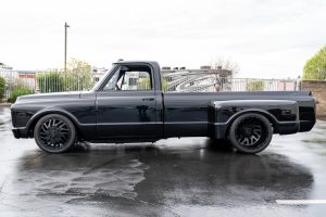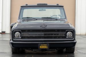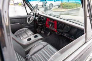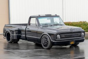 THIS… is a 1969 Chevrolet C10, finished in black with a black and red interior. This truck has been restored, according to the seller. Although it’s titled in California as a 1969 Chevrolet C10, the build is based on a customized 2005 Chevrolet Silverado HD chassis with a Duramax 6.6-liter turbodiesel V8 engine, Allison 5-speed automatic transmission, and a part-time 4-wheel drive system. A partial list of notable currently installed equipment reported by the seller includes an EFILive engine management system, an aftermarket turbocharger, 20-inch TIS Offroad wheels, KYB Excel-G shocks, TMI Products seats, Vintage Air air conditioning, and aftermarket parts in the sound system. Chevrolet unveiled the second-generation C/K truck for the 1967 model year. The range included several models, including two- and four-wheel-drive variants, and Chevrolet made several comfort-related improvements to the C/K to cater to the growing number of motorists who used a pickup as a daily driver. The second-generation C/K also spawned the original Blazer. Production ended in 1972. Power comes from a 6.6-liter turbodiesel V8, rated at 310 horsepower and 520 lb-ft of torque in stock form. Due to the modifications performed to this C10, it may produce more power, but a dyno sheet was not provided to confirm. Output is sent to the rear or the six wheels via a 5-speed automatic transmission and a 2-speed transfer case.