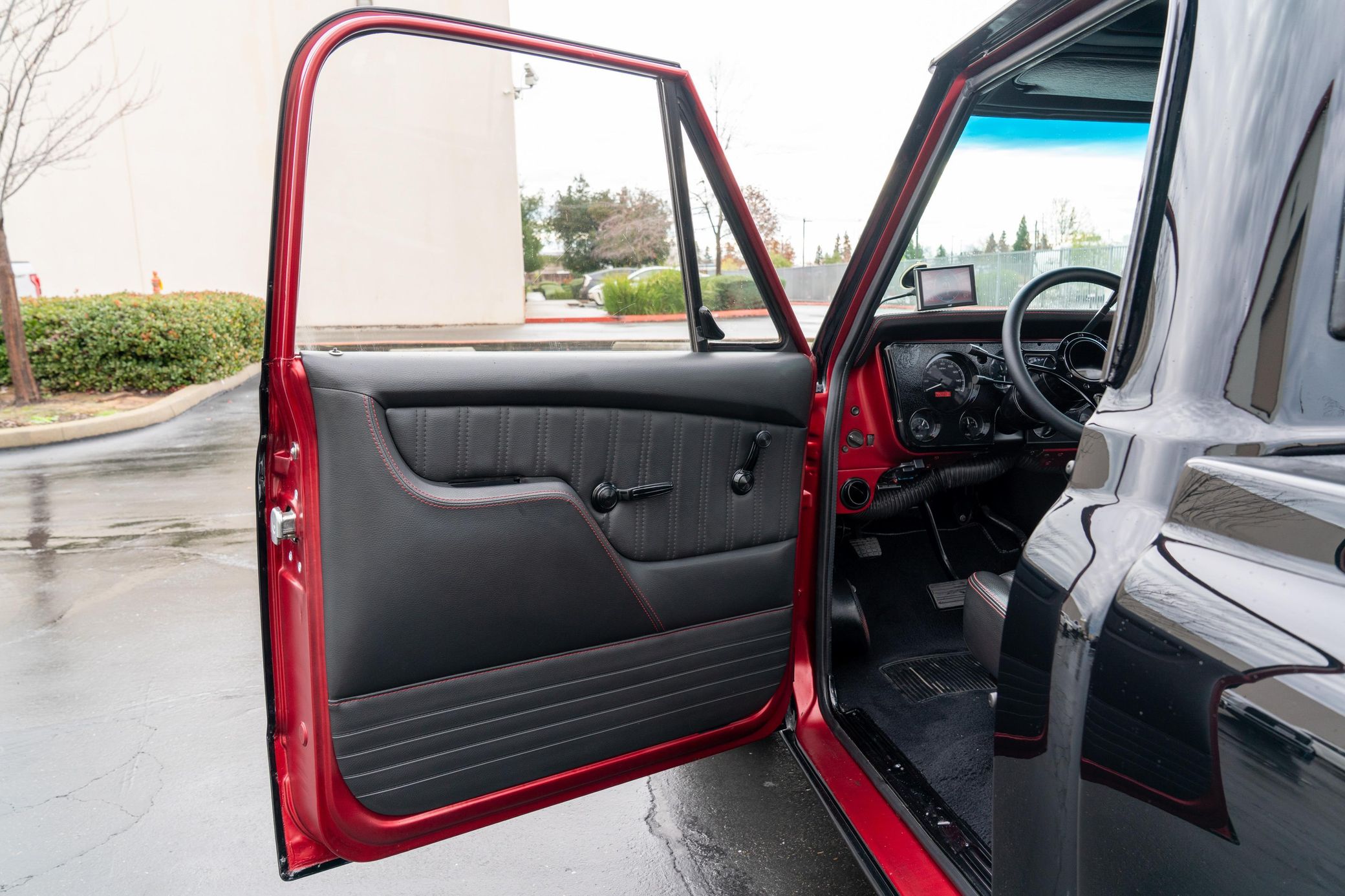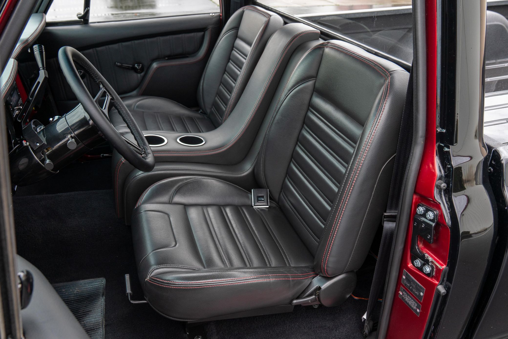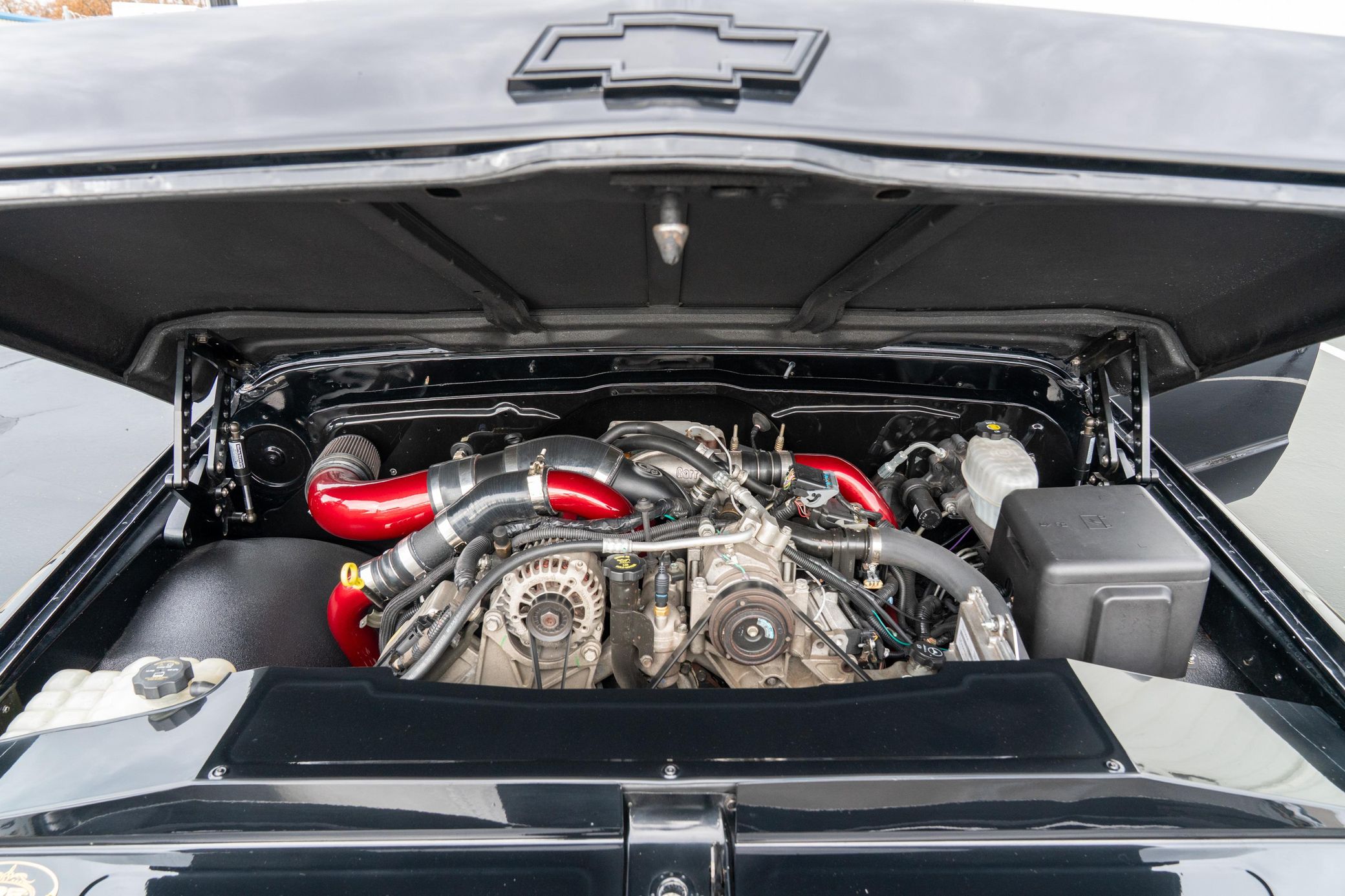 THIS… is a 1969 Chevrolet C10, finished in black with a black and red interior. This truck has been restored, according to the seller. Although it’s titled in California as a 1969 Chevrolet C10, the build is based on a customized 2005 Chevrolet Silverado HD chassis with a Duramax 6.6-liter turbodiesel V8 engine, Allison 5-speed automatic transmission, and a part-time 4-wheel drive system. A partial list of notable currently installed equipment reported by the seller includes an EFILive engine management system, an aftermarket turbocharger, 20-inch TIS Offroad wheels, KYB Excel-G shocks, TMI Products seats, Vintage Air air conditioning, and aftermarket parts in the sound system. Chevrolet unveiled the second-generation C/K truck for the 1967 model year. The range included several models, including two- and four-wheel-drive variants, and Chevrolet made several comfort-related improvements to the C/K to cater to the growing number of motorists who used a pickup as a daily driver. The second-generation C/K also spawned the original Blazer. Production ended in 1972. Power comes from a 6.6-liter turbodiesel V8, rated at 310 horsepower and 520 lb-ft of torque in stock form. Due to the modifications performed to this C10, it may produce more power, but a dyno sheet was not provided to confirm. Output is sent to the rear or the six wheels via a 5-speed automatic transmission and a 2-speed transfer case.