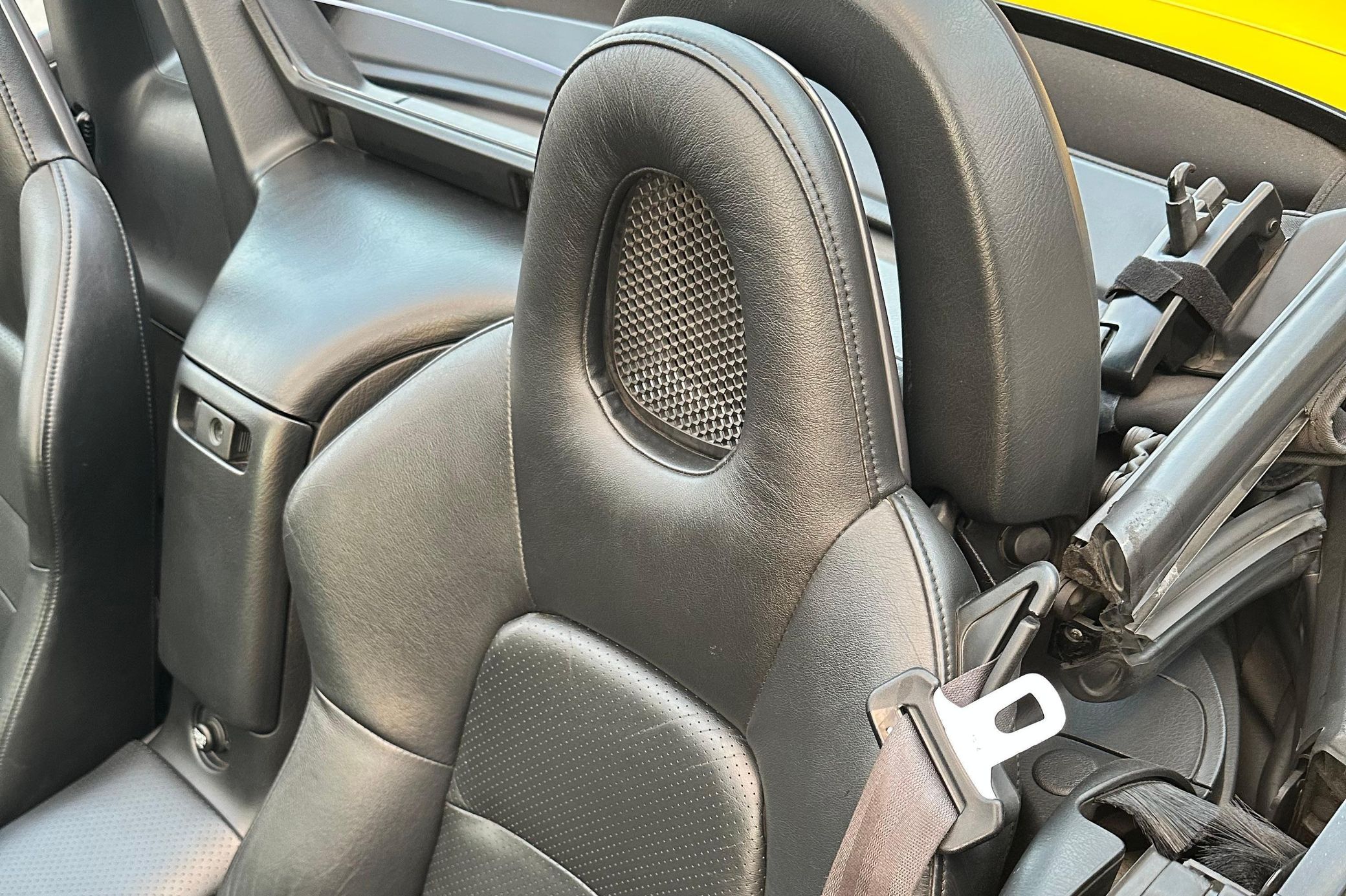 A partial list of notable equipment reported by the seller includes 16-inch wheels, a limited-slip differential, a power-operated soft top, leather upholstery, and cruise control. Notable modifications reported by the seller are limited to a Spoon front strut bar.