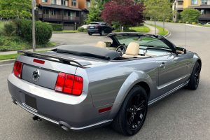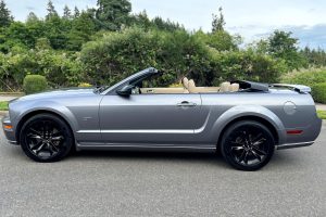 THIS… is a 2006 Ford Mustang GT Convertible, finished in Tungsten Grey Metallic with a black soft top and a Parchment interior. This Mustang features the desirable 5-speed manual transmission. The attached Carfax vehicle history report contains a reporting gap from 2007 to 2011, though it shows no accidents or mileage discrepancies during the given time period; it also shows that this Mustang has been registered in California, Oregon, and Washington since new. A partial list of notable equipment reported by the seller includes a limited-slip differential, a power-operated soft top, leather upholstery, air conditioning, and cruise control. Notable modifications reported by the seller include 18-inch 2024 Ford Mustang wheels, a Draw-Tite tow hitch receiver, and a Kenwood head unit. 2005 was the first model year for the 5th-generation, or S197, Ford Mustang, which brought with it stylish retro aesthetics and welcome chassis upgrades. It replaced the Fox platform-derived SN95, making the S197 a thorough modernization of the iconic Mustang. Power comes from a 4.6-liter V8, which produces 300 horsepower and 320 lb-ft of torque. Output is sent to the rear wheels via a 5-speed manual transmission.