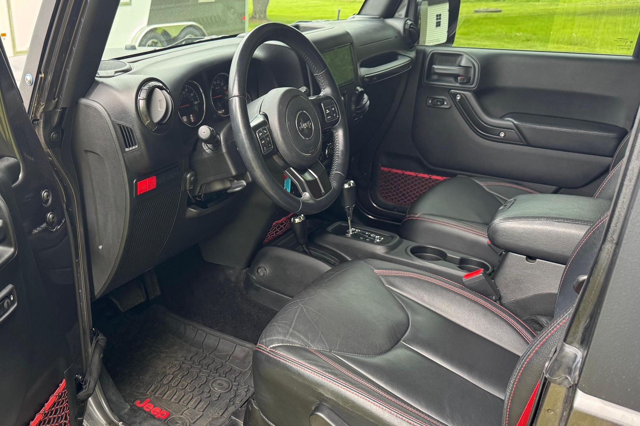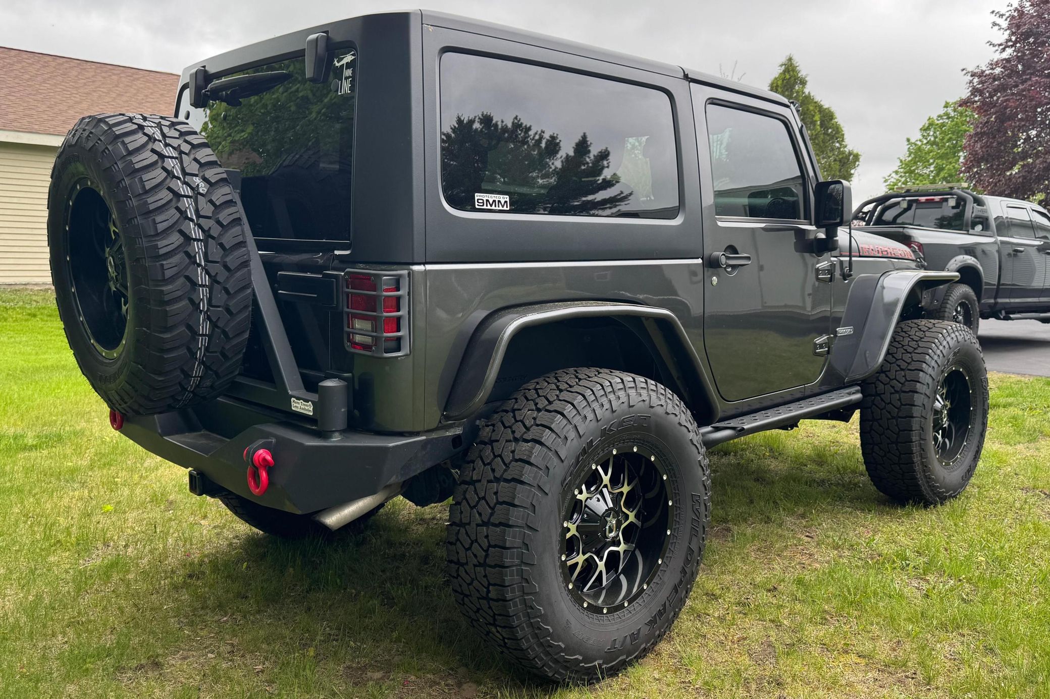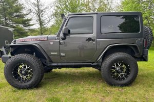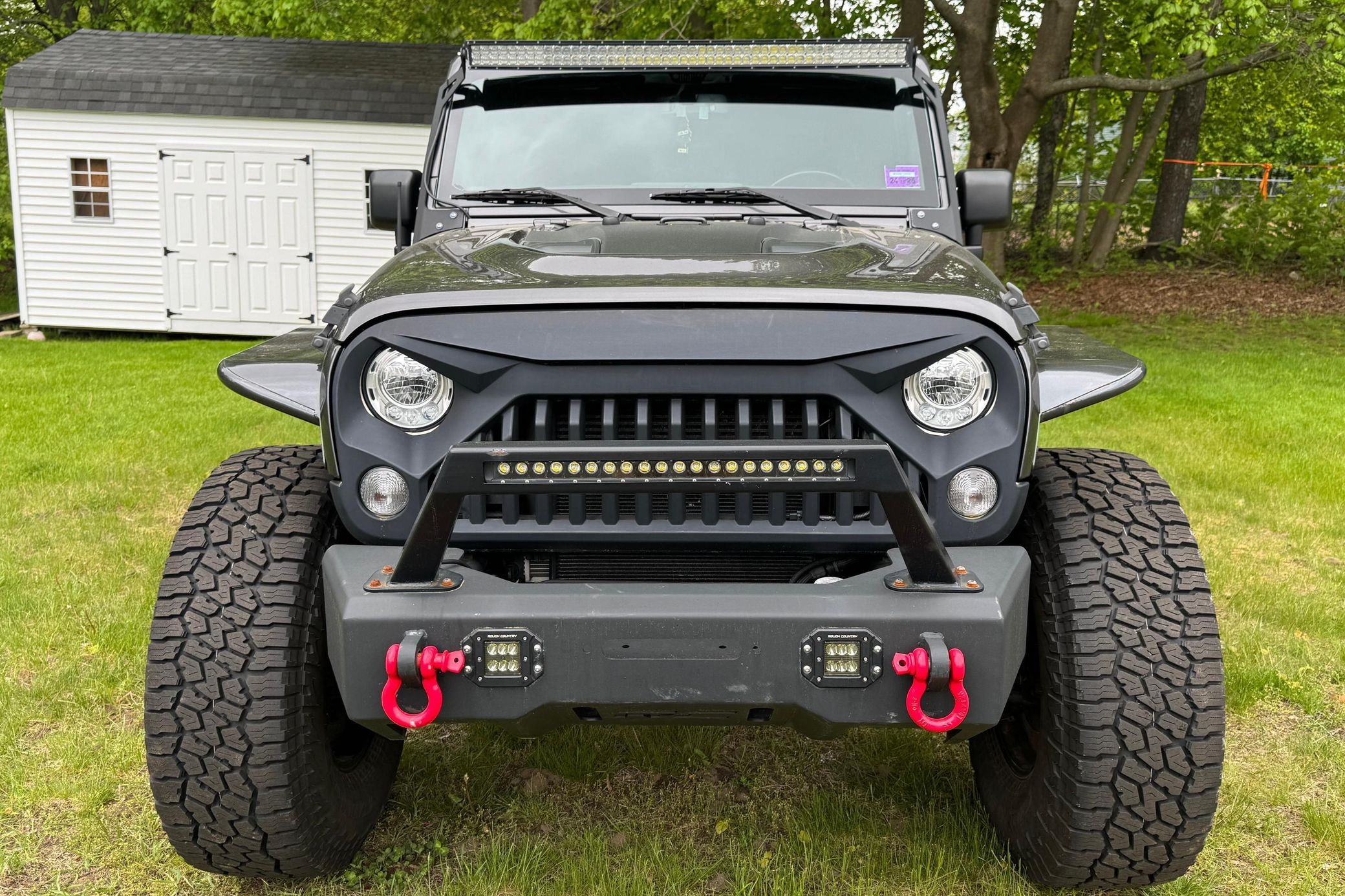 Notable modifications reported by the seller include: Rough Country 6-inch lift kit Fox shocks Mopar cold air intake Aftermarket 18-inch wheels 37-inch tires Aftermarket grille Rouch Country steel flares, bumpers, and rear tire carrier Aftermarket LED light bar Aftermarket tailight guards and tubular step guards Alpine Apple CarPlay and Android Auto compatible headunit Alpine speakers and subwoofer