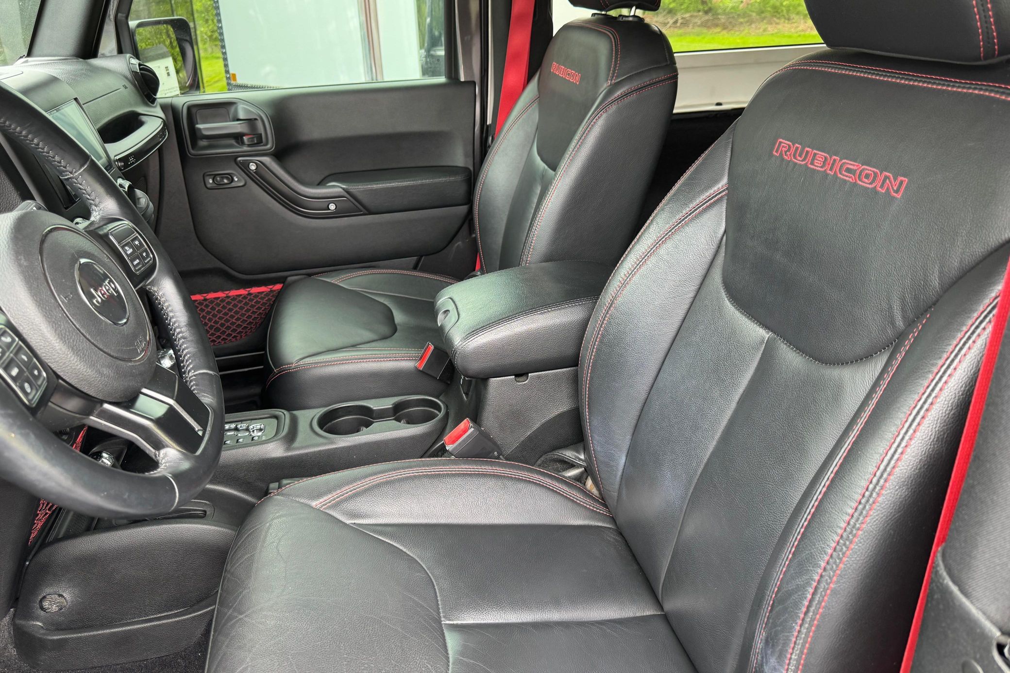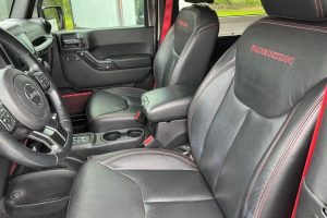 A digital window sticker is provided in the photo gallery, and a partial list of notable equipment reported by the seller includes: Rubicon Recon Edition 24Z (HD rock rails with step pad, red front and rear tow hooks, air conditioning with automatic temperature control, black fuel filler door, connectivity group, Uconnect voice command with Bluetooth, and more) Dana 44 switchable locker axles Electronically detachable front sway bar Leather upholstery Heated front seats 3-piece hard top Hill descent control