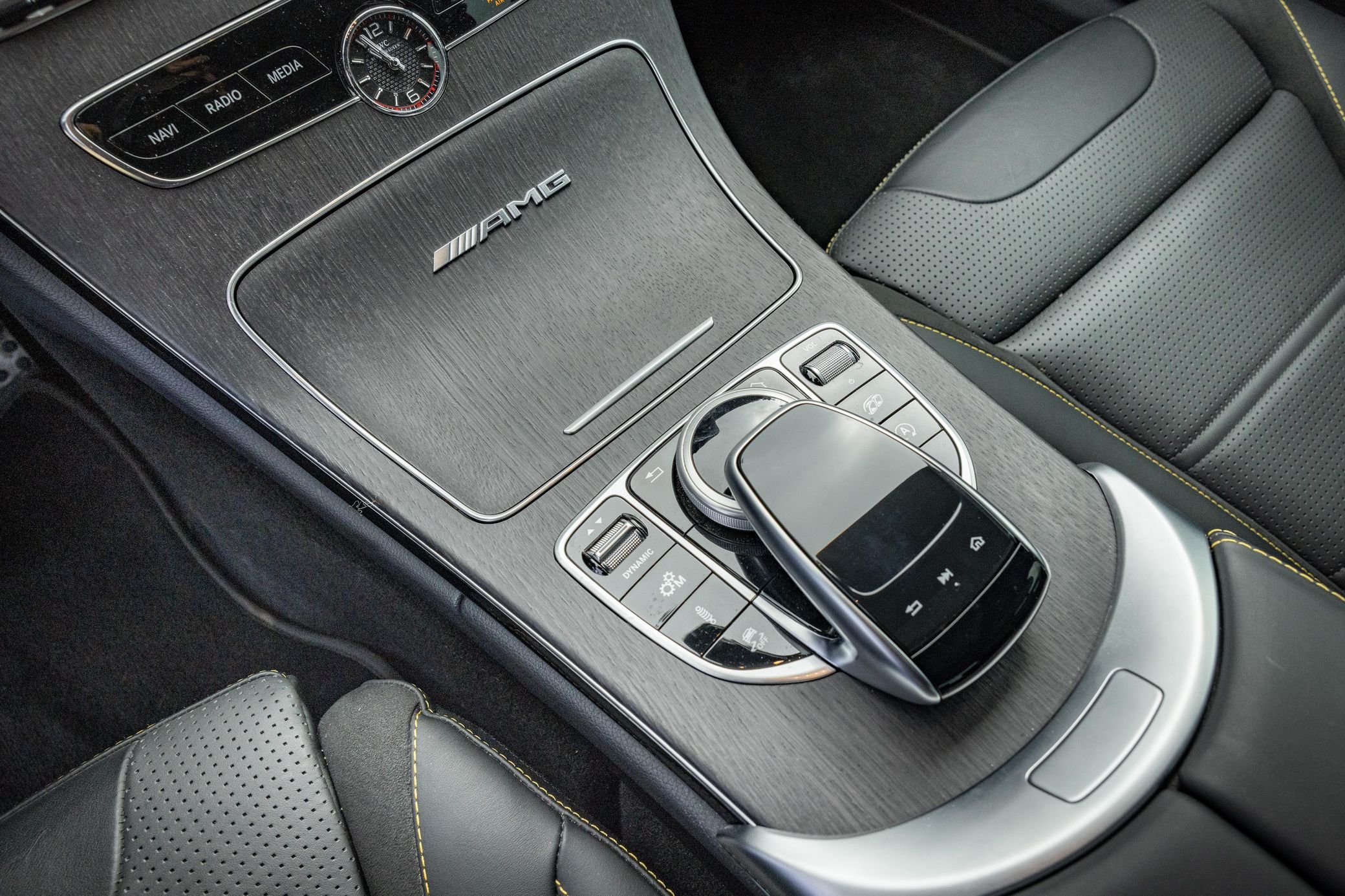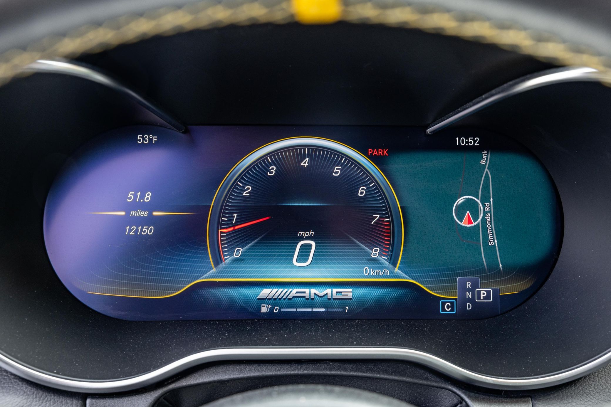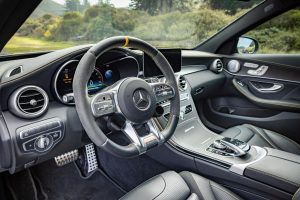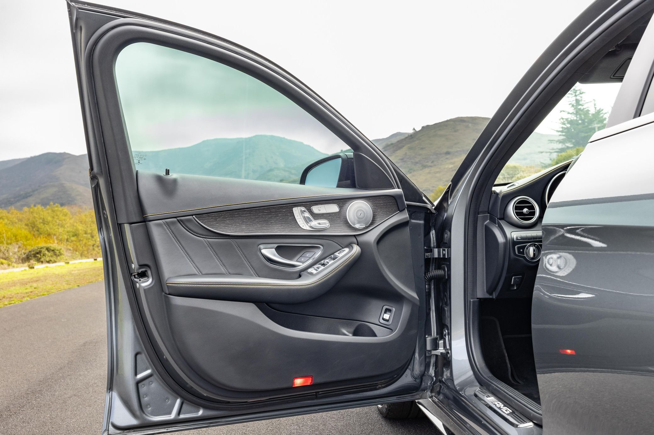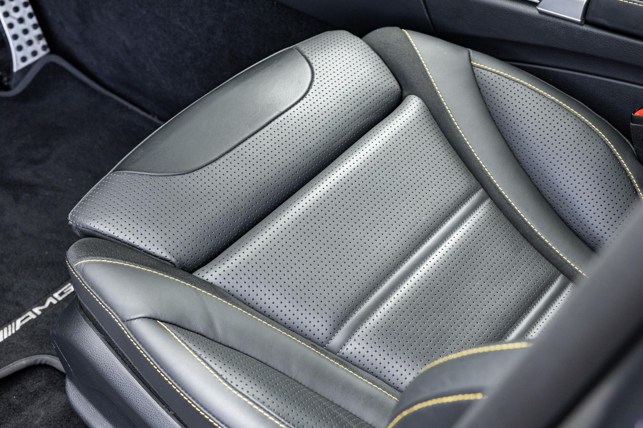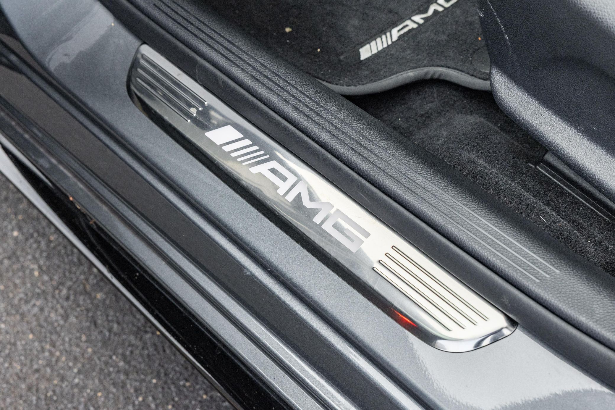 A build sheet is provided in the photo gallery, and a partial list of notable equipment reported by the seller includes: – Premium Package (Burmester surround sound system, 64-color LED ambient lighting, illuminated front door sills) – AMG Night Package (high-gloss black exterior trim, black chrome-plated exhaust tailpipes) – Parking Assistance Package (Active Parking Assist, Surround View System) – 19-inch AMG wheels – Panoramic sunroof – Nappa leather upholstery – Power-adjustable and heated front seats