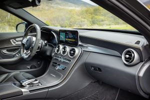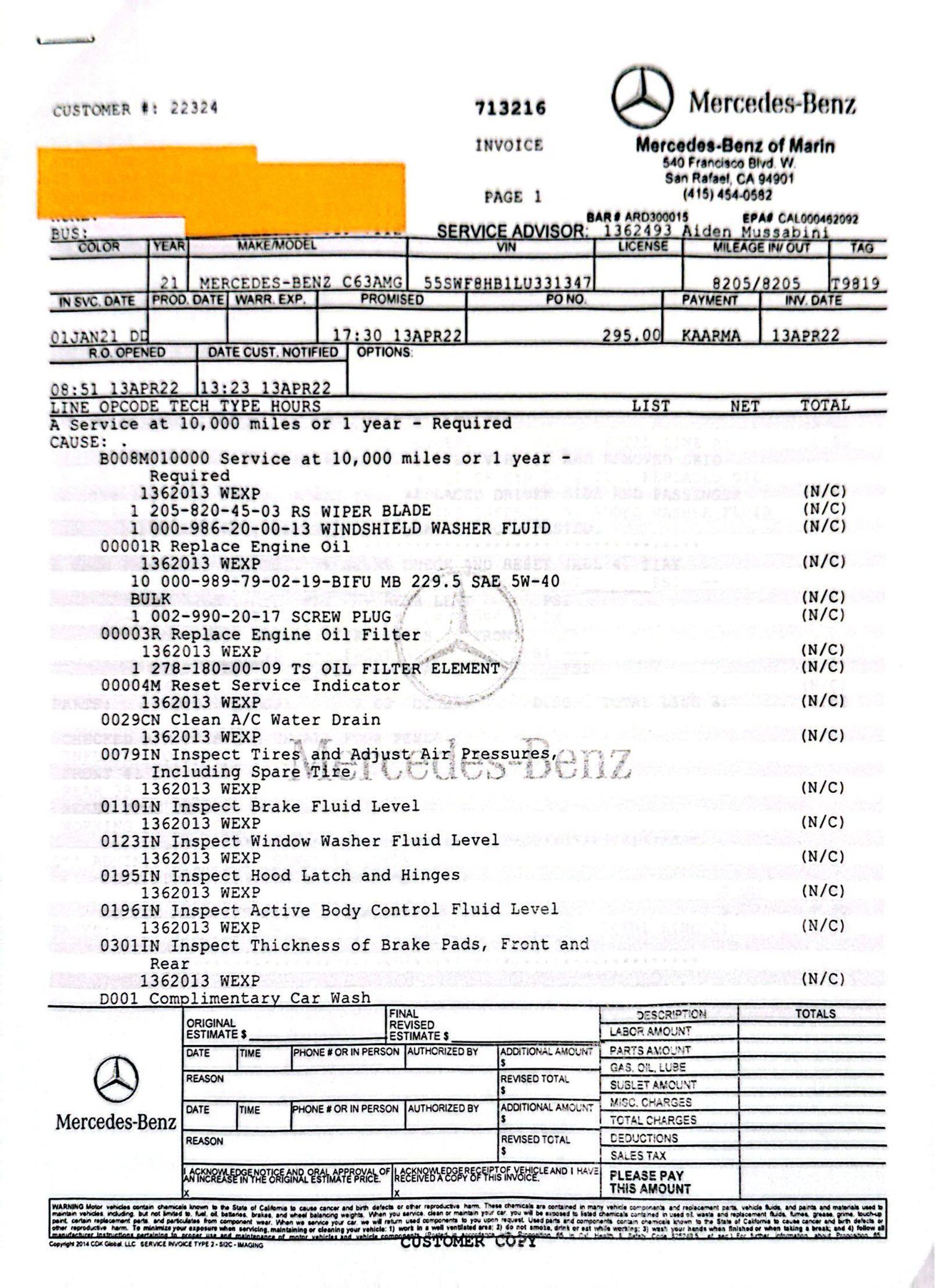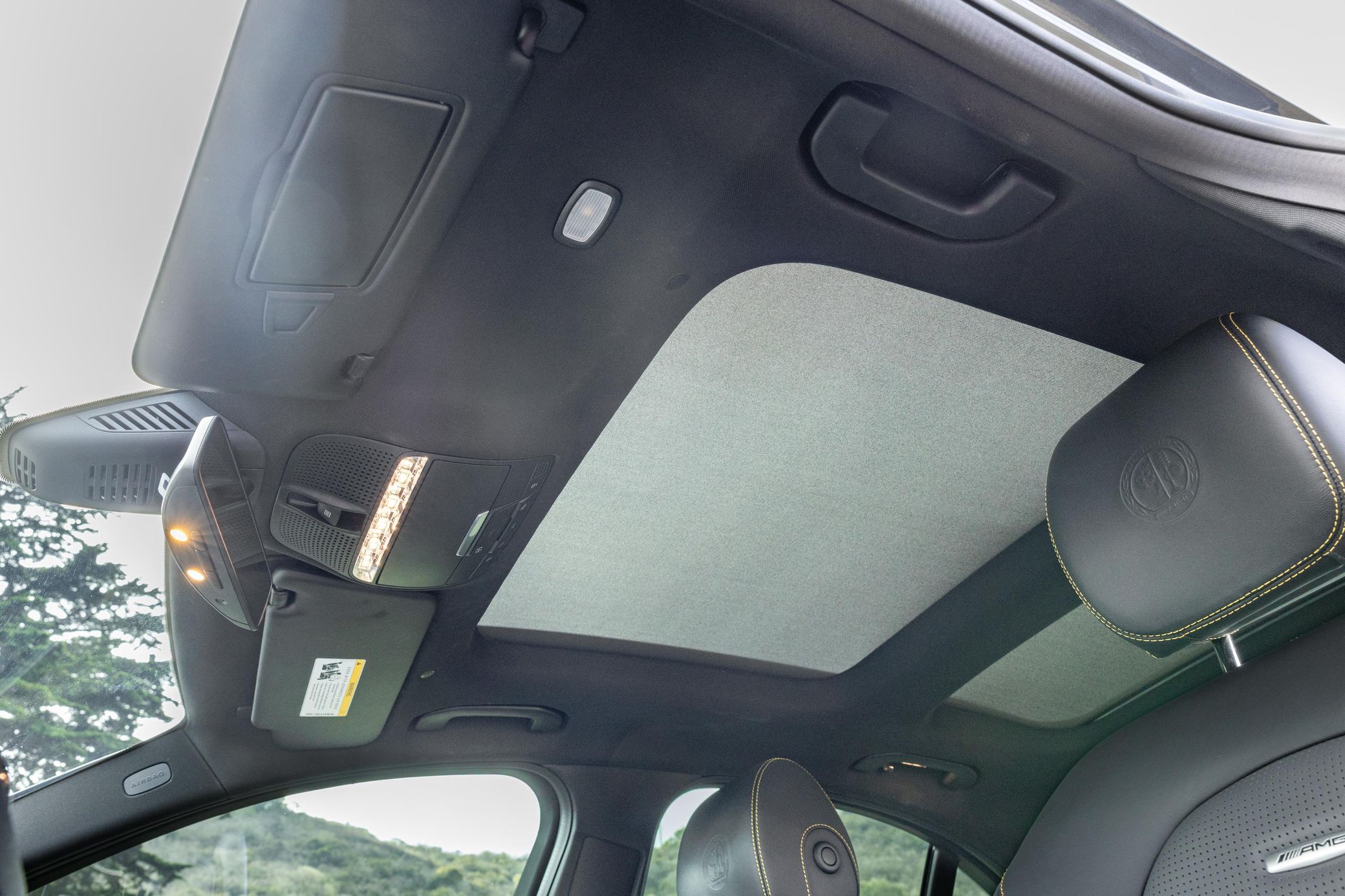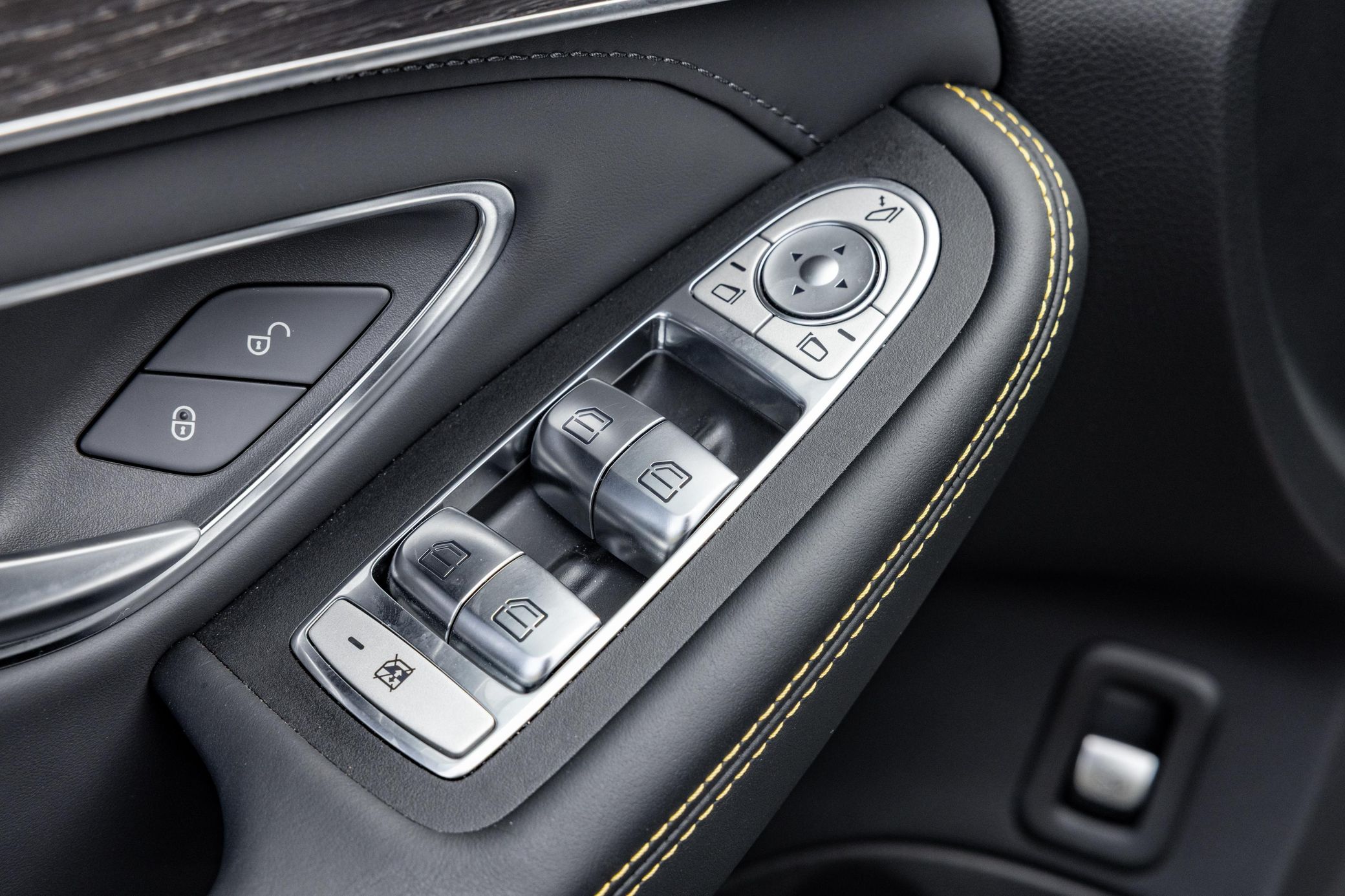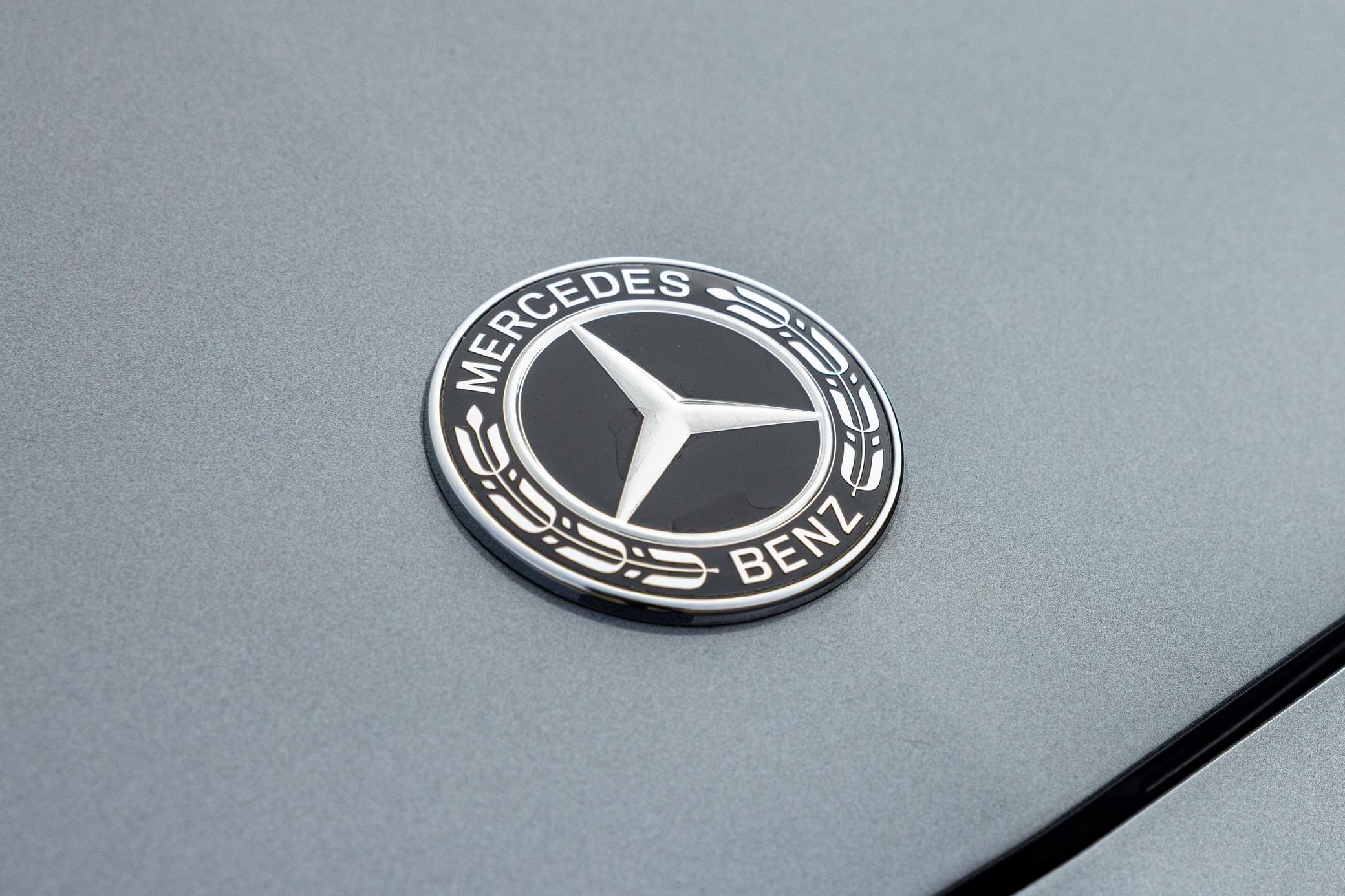 A build sheet is provided in the photo gallery, and a partial list of notable equipment reported by the seller includes: – Premium Package (Burmester surround sound system, 64-color LED ambient lighting, illuminated front door sills) – AMG Night Package (high-gloss black exterior trim, black chrome-plated exhaust tailpipes) – Parking Assistance Package (Active Parking Assist, Surround View System) – 19-inch AMG wheels – Panoramic sunroof – Nappa leather upholstery – Power-adjustable and heated front seats