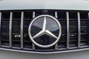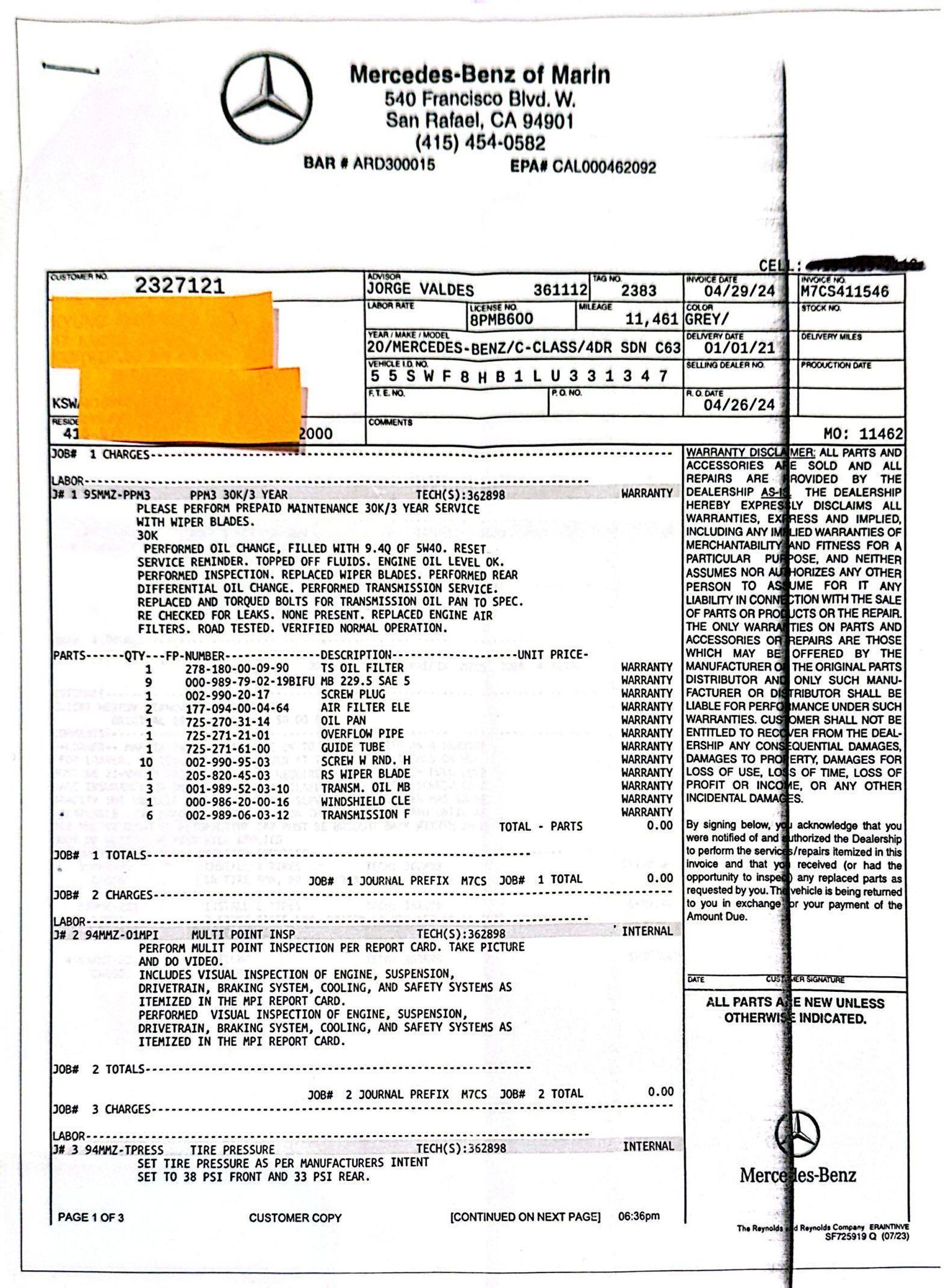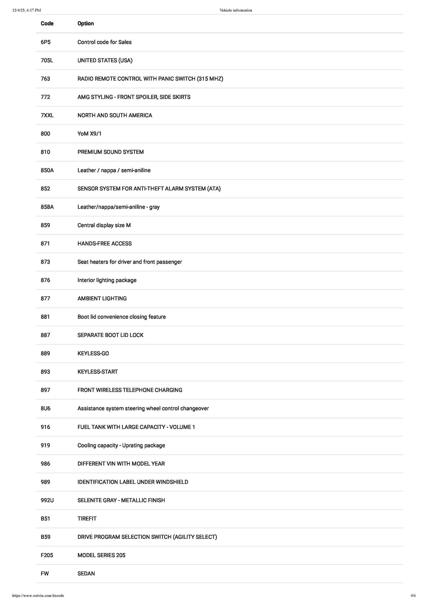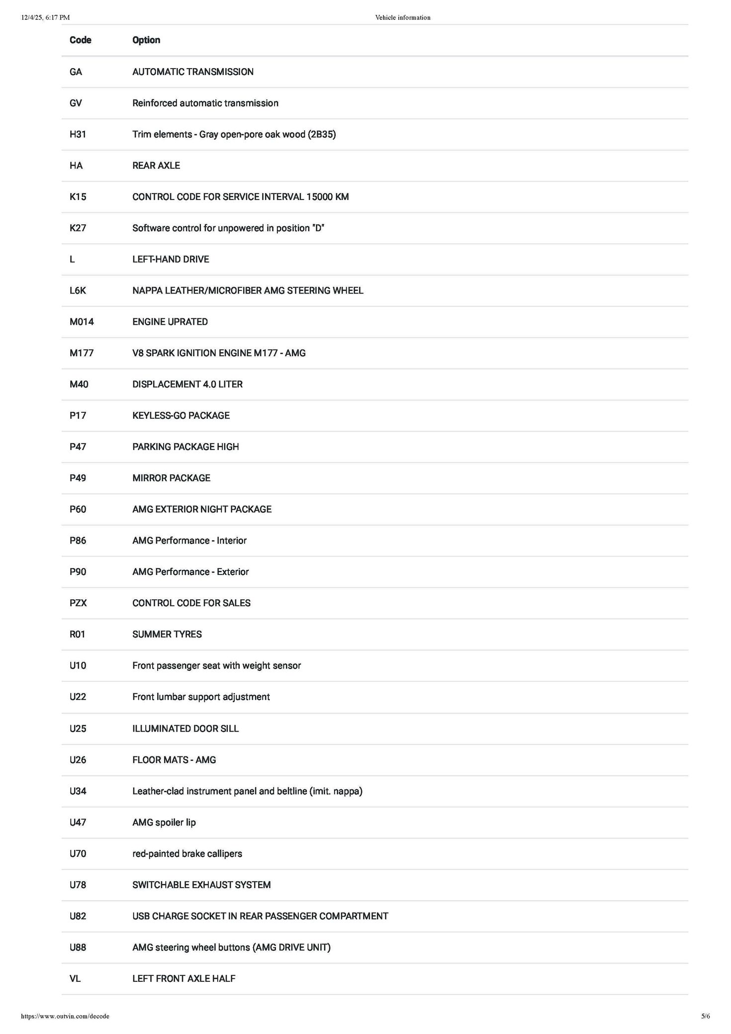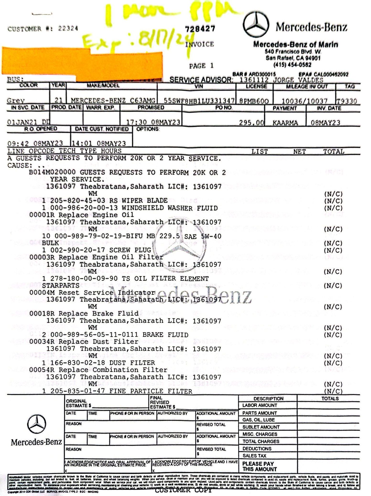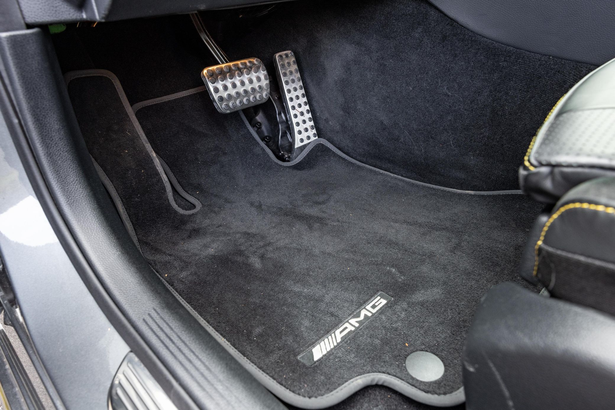 A build sheet is provided in the photo gallery, and a partial list of notable equipment reported by the seller includes: – Premium Package (Burmester surround sound system, 64-color LED ambient lighting, illuminated front door sills) – AMG Night Package (high-gloss black exterior trim, black chrome-plated exhaust tailpipes) – Parking Assistance Package (Active Parking Assist, Surround View System) – 19-inch AMG wheels – Panoramic sunroof – Nappa leather upholstery – Power-adjustable and heated front seats