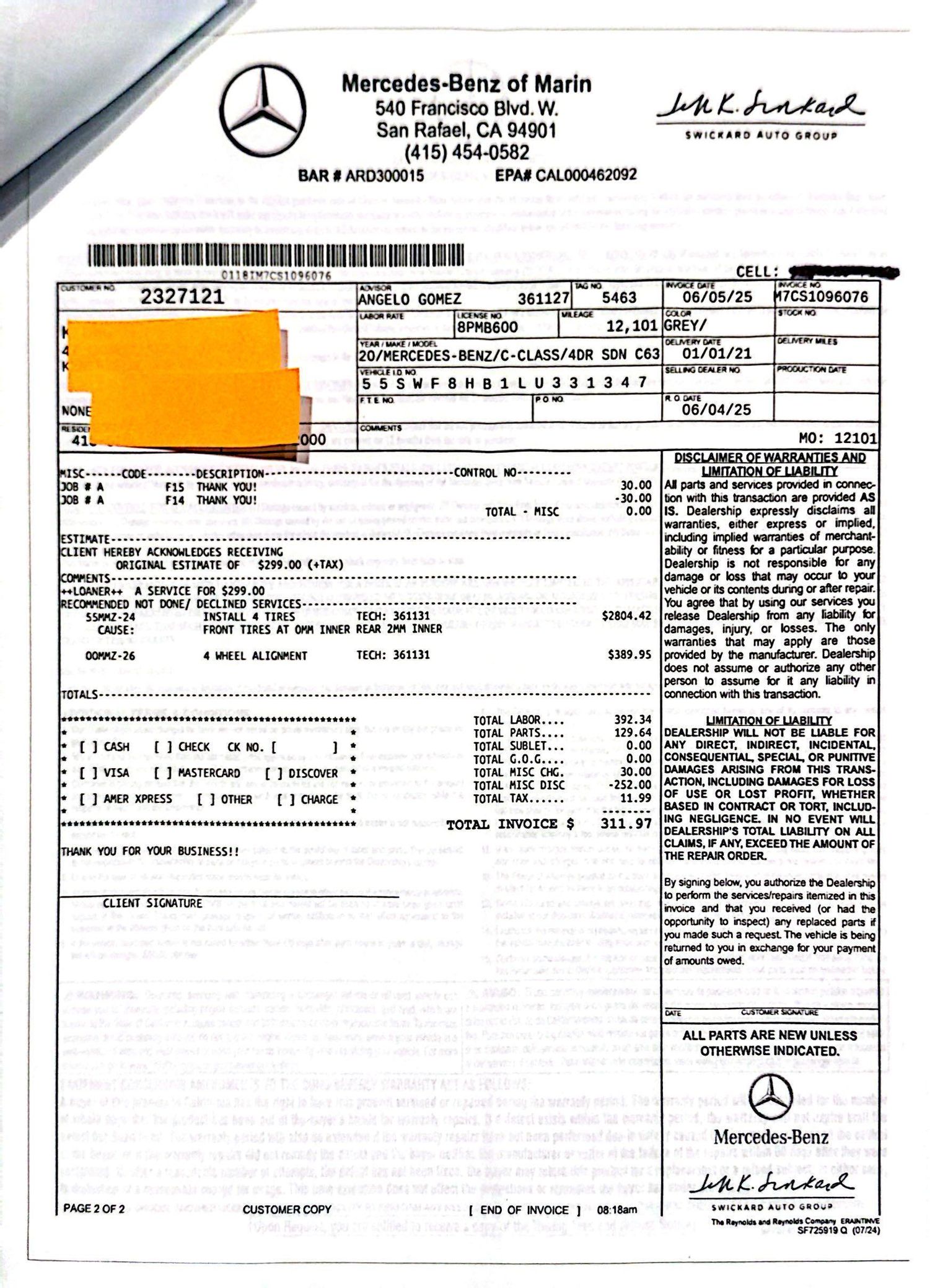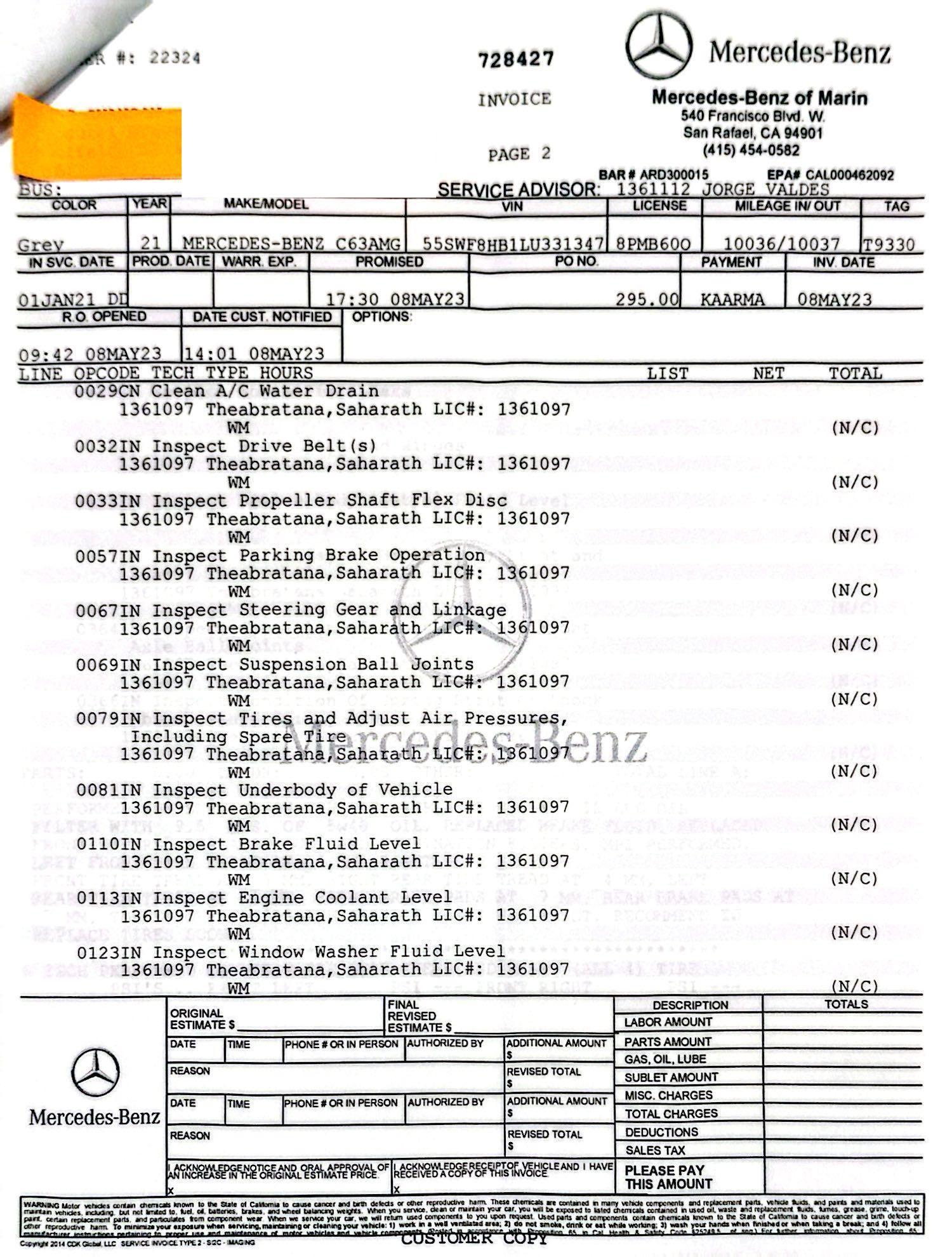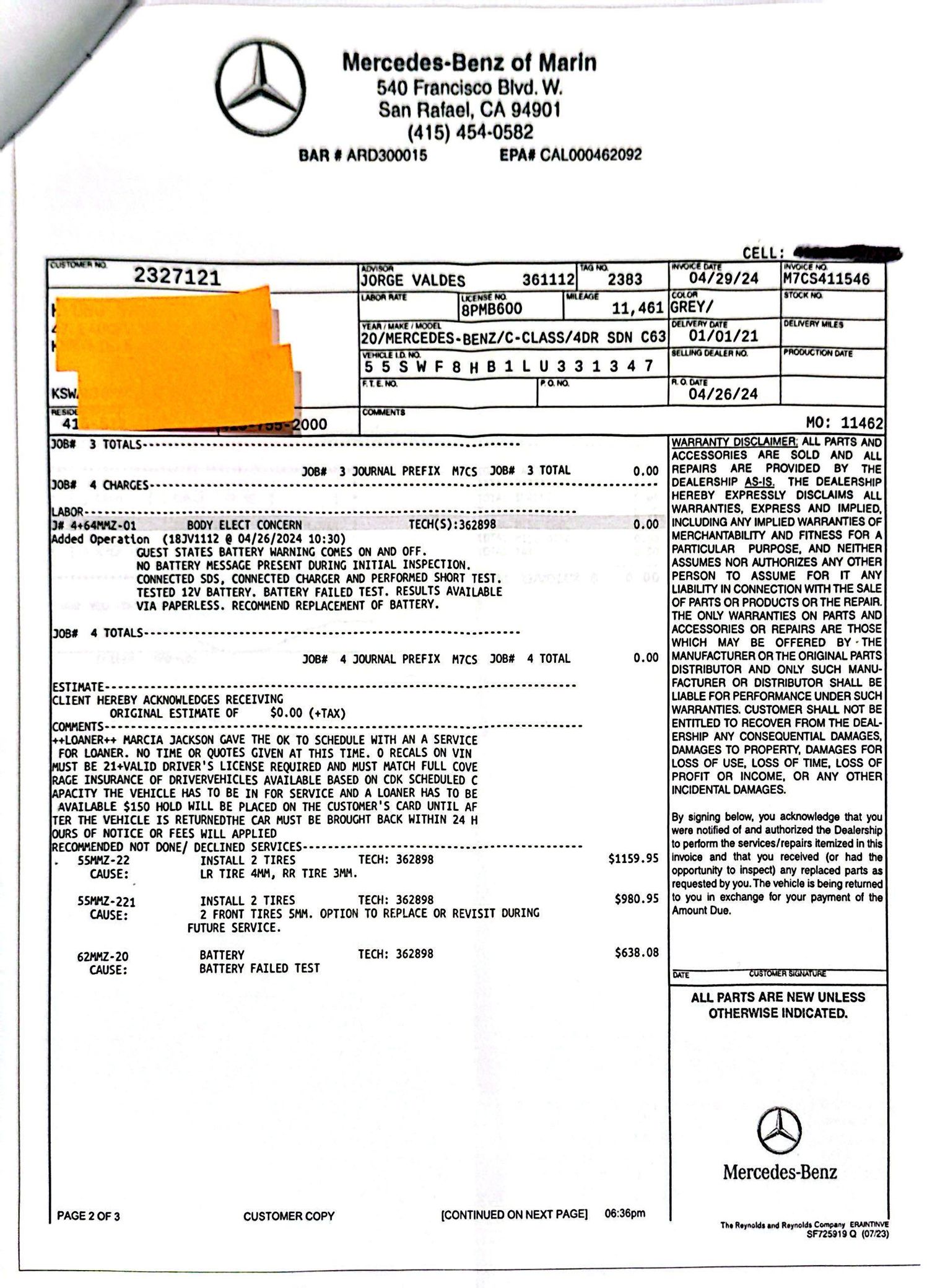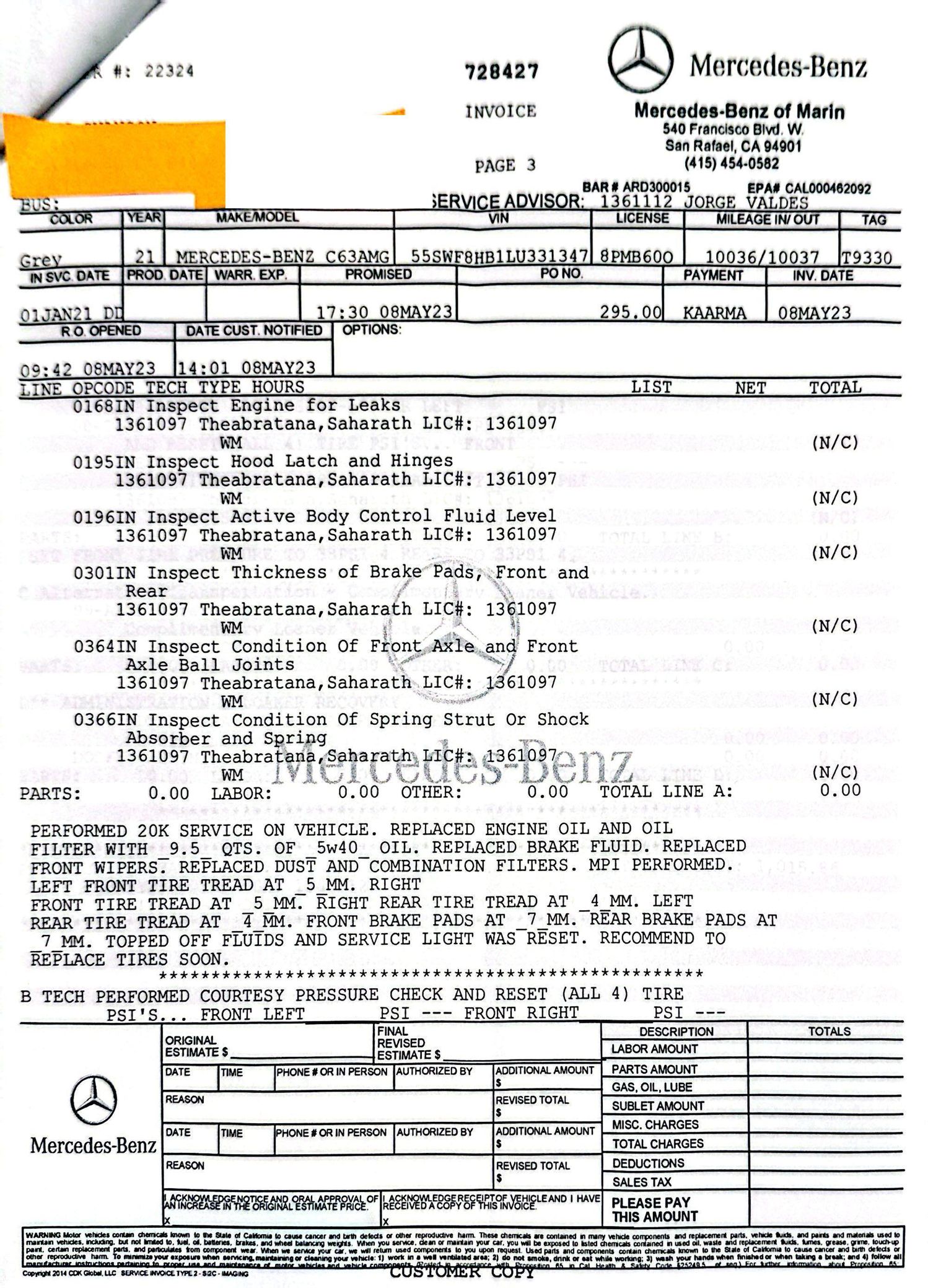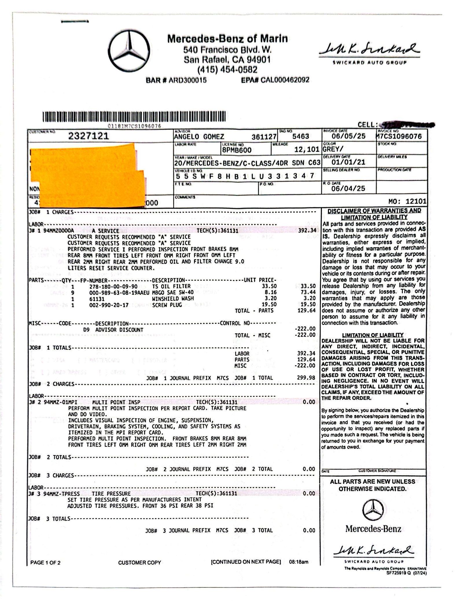 A build sheet is provided in the photo gallery, and a partial list of notable equipment reported by the seller includes: – Premium Package (Burmester surround sound system, 64-color LED ambient lighting, illuminated front door sills) – AMG Night Package (high-gloss black exterior trim, black chrome-plated exhaust tailpipes) – Parking Assistance Package (Active Parking Assist, Surround View System) – 19-inch AMG wheels – Panoramic sunroof – Nappa leather upholstery – Power-adjustable and heated front seats