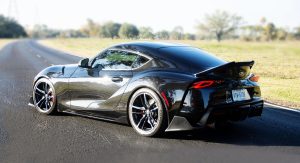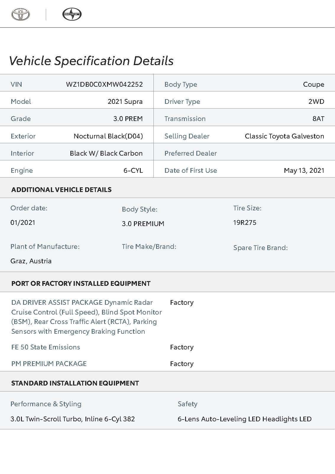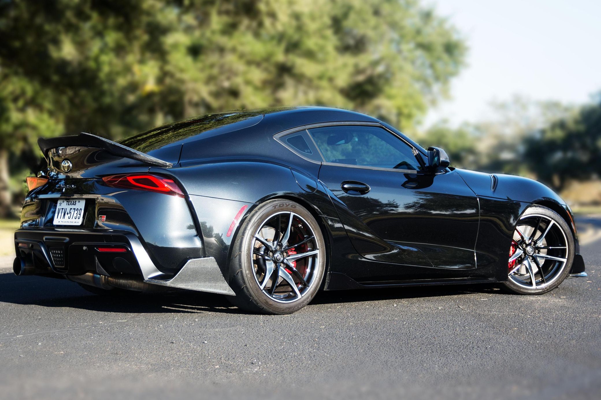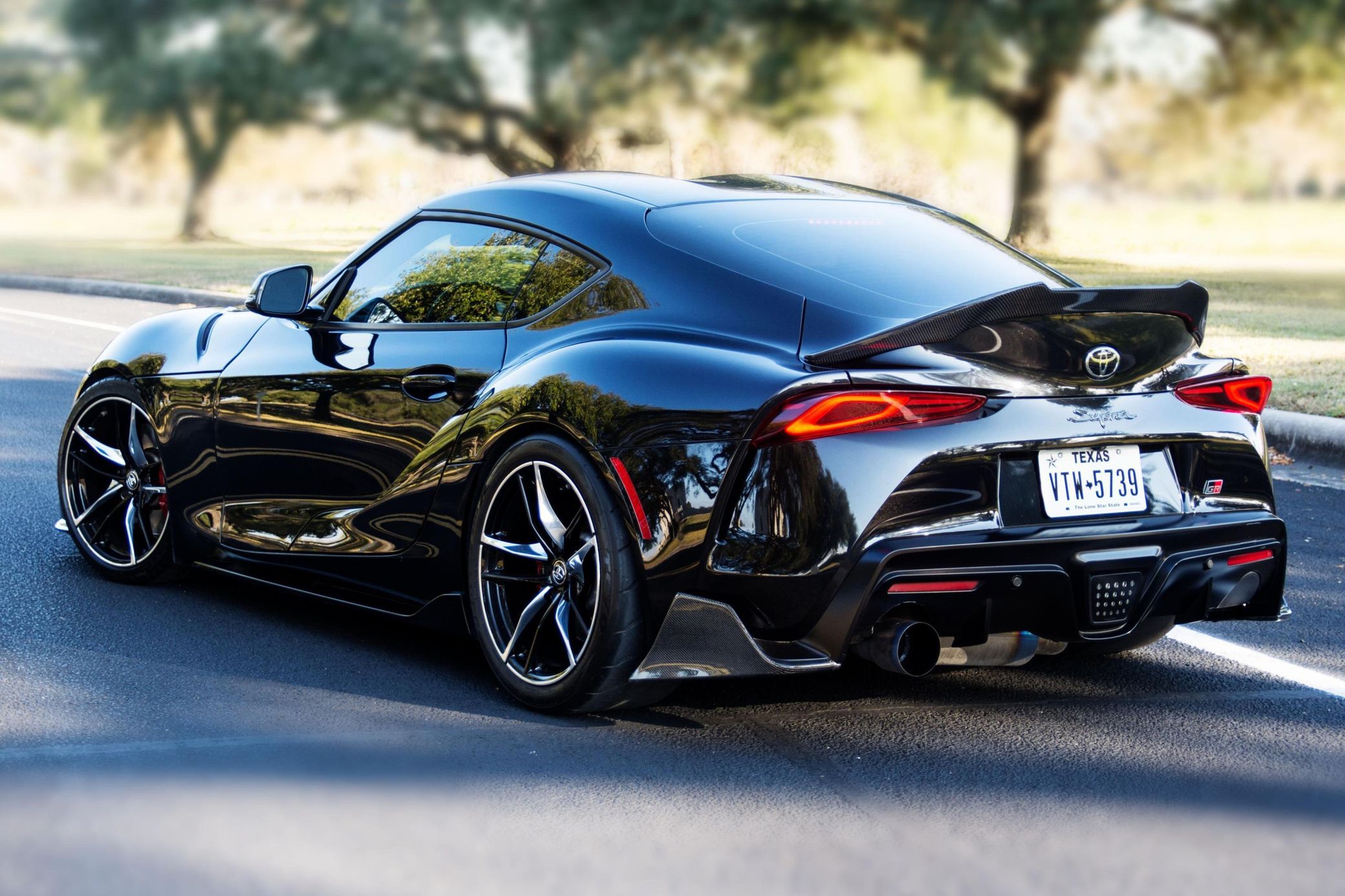 THIS… is a 2021 Toyota Supra 3.0 Premium, finished in Nocturnal Black with a black interior. According to the build sheet provided in the gallery, notable factory equipment includes the Driver Assist Package, 19-inch wheels, an active sport differential, and a 12-speaker JBL sound system. Notable modifications reported by the seller include a Precision turbocharger, a Spool Performance top-mount turbo kit, a Project Gamma intake manifold, a Tomei Extreme Ti exhaust, a Pure Drivetrain Solutions transmission upgrade, and H&R lowering springs. The fifth-generation Supra, known as the A90, was introduced for the 2020 model year and marked the return of Toyota’s iconic sports car after a long hiatus. Developed in collaboration with BMW, the A90 Supra features a modern chassis and advanced technology while maintaining a focus on driving dynamics. It has quickly become popular among enthusiasts for its blend of performance, comfort, and heritage. Power comes from a turbocharged 3.0-liter straight-6, rated at 382 horsepower and 368 lb-ft of torque in stock form. According to the dyno sheet pictured in the gallery, this Supra now produces 649 horsepower and 585 lb-ft of torque as a result of its modifications. Output is sent to the rear wheels via an 8-speed automatic transmission.