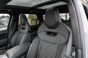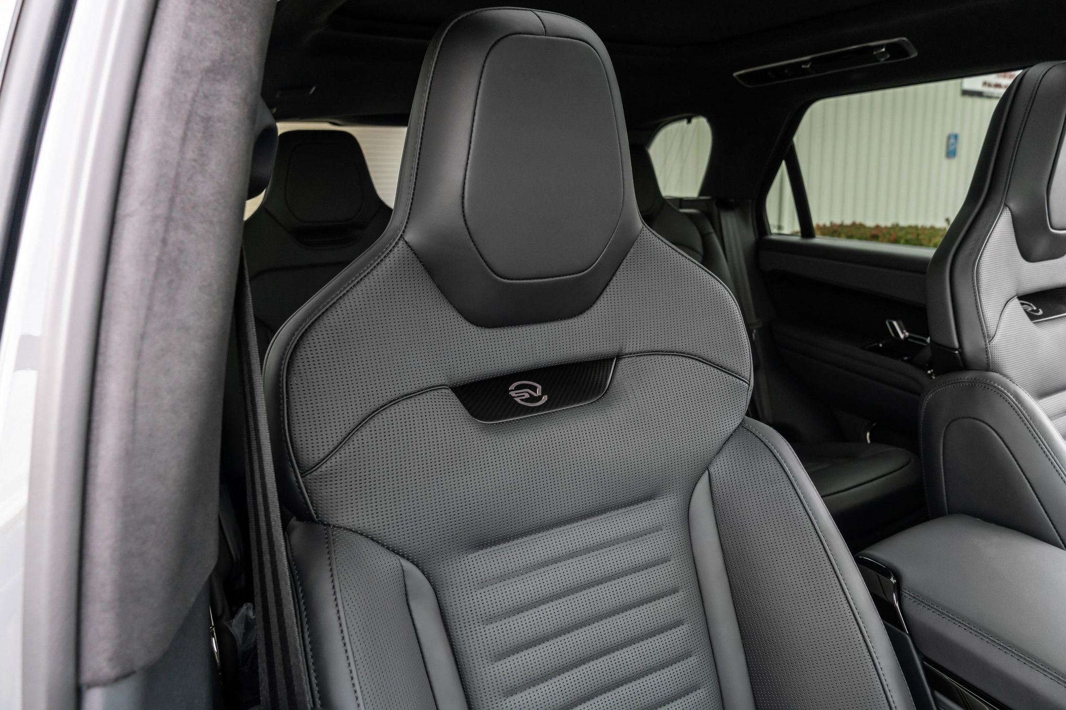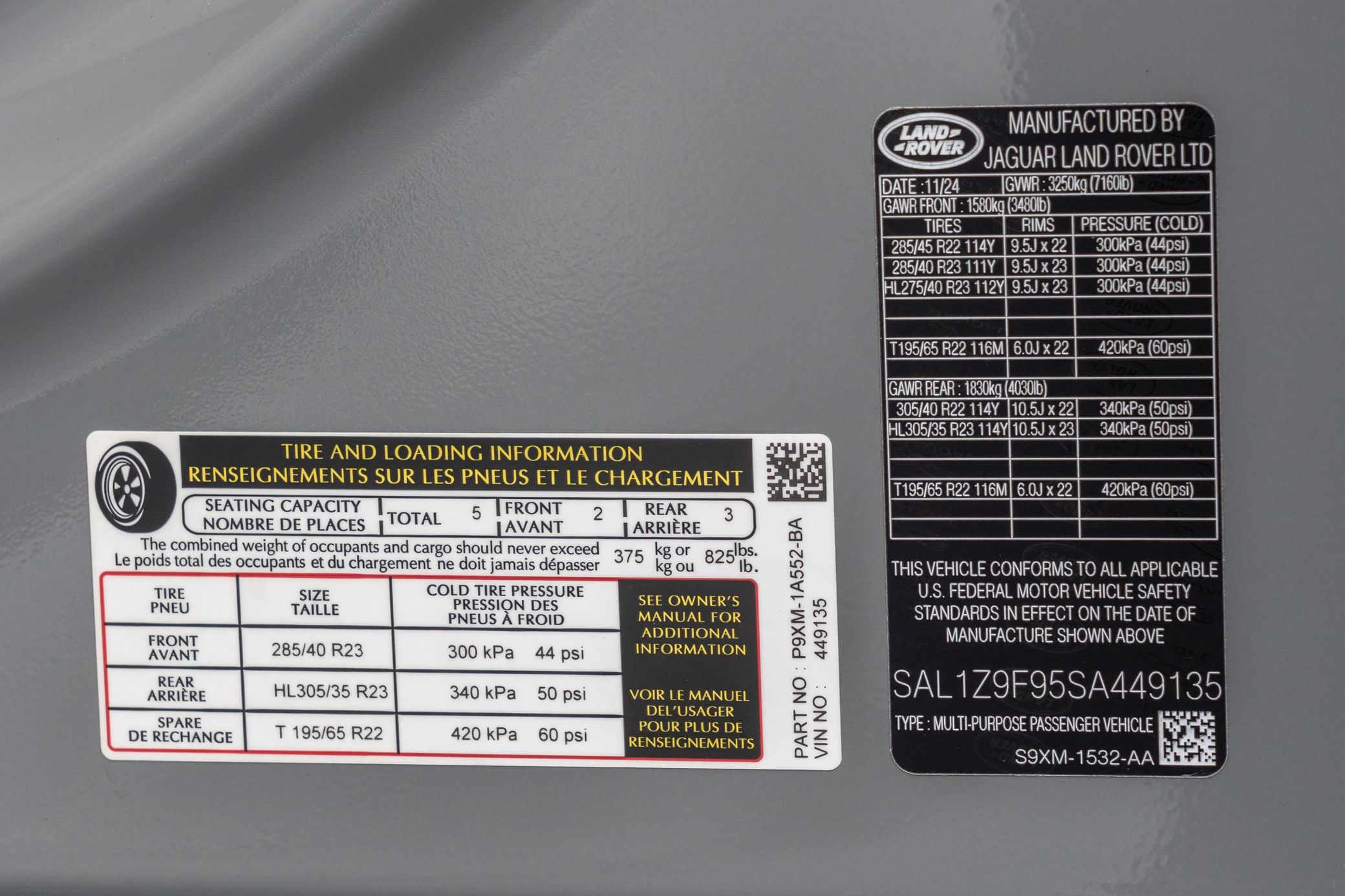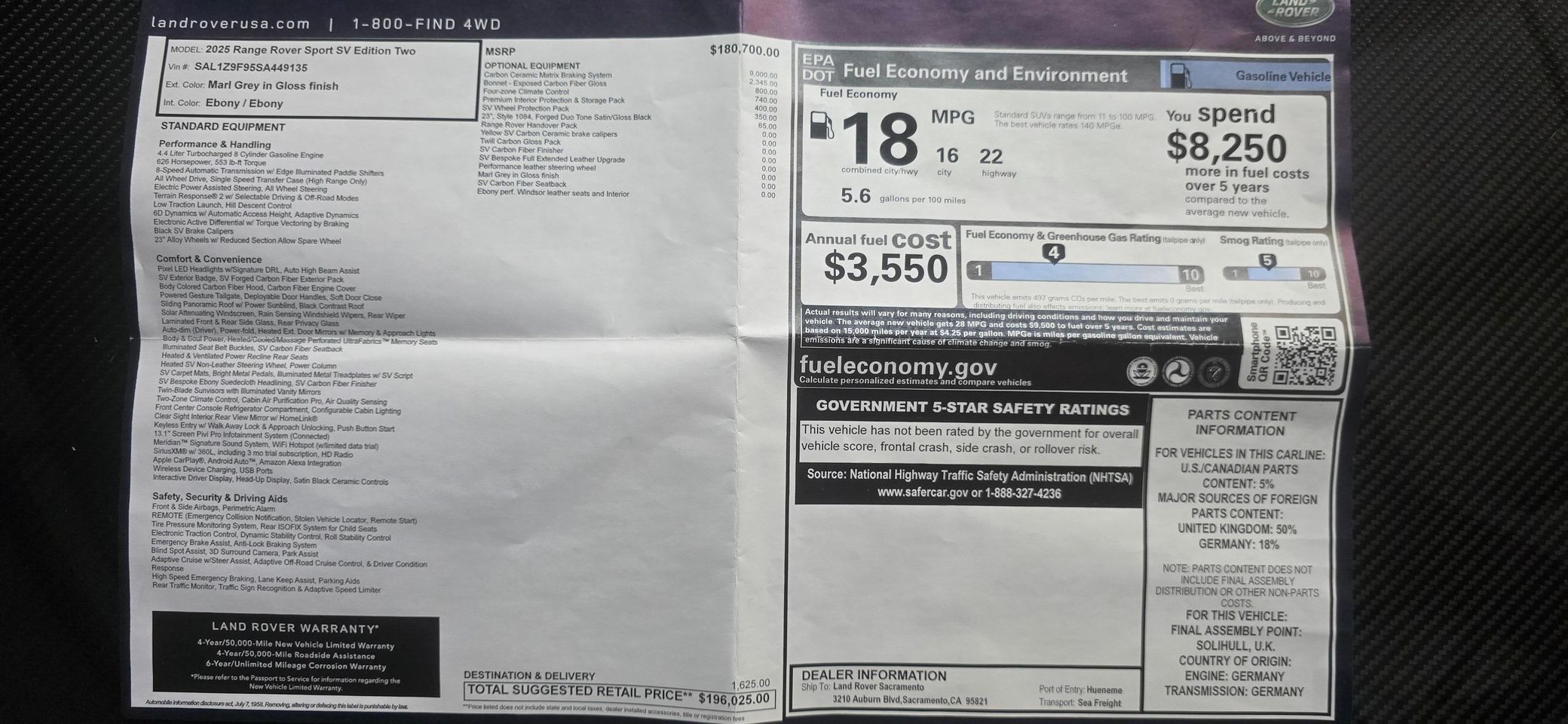 THIS… is a 2025 Range Rover Sport P635 SV Edition Two, finished in Marl Grey with an Ebony interior. The odometer on this Range Rover Sport currently displays approximately 1,600 miles. According to the window sticker provided in the gallery, notable factory equipment includes 23-inch Style 1084 forged wheels, a Carbon Ceramic Matrix braking system, an exposed carbon fiber hood, SV Bespoke full extended leather upholstery, heated, ventilated, and massaging front seats, and a Meridian Signature sound system. The seller reports no notable modifications. Introduced for the 2023 model year, the L461 is the third generation of the Range Rover Sport. The Sport is a smaller and sportier alternative to larger Range Rover SUVs, yet it retains the high level of luxury and refinement expected from the brand. Power comes from a 4.4-liter twin-turbocharged V8, rated at 626 horsepower and 553 lb-ft of torque. Output is sent to all four wheels via an 8-speed automatic transmission.